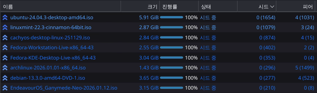 배포판들의 공식 사이트에서 torrent 파일을 받아서 qbittorrent에서 확인했다.